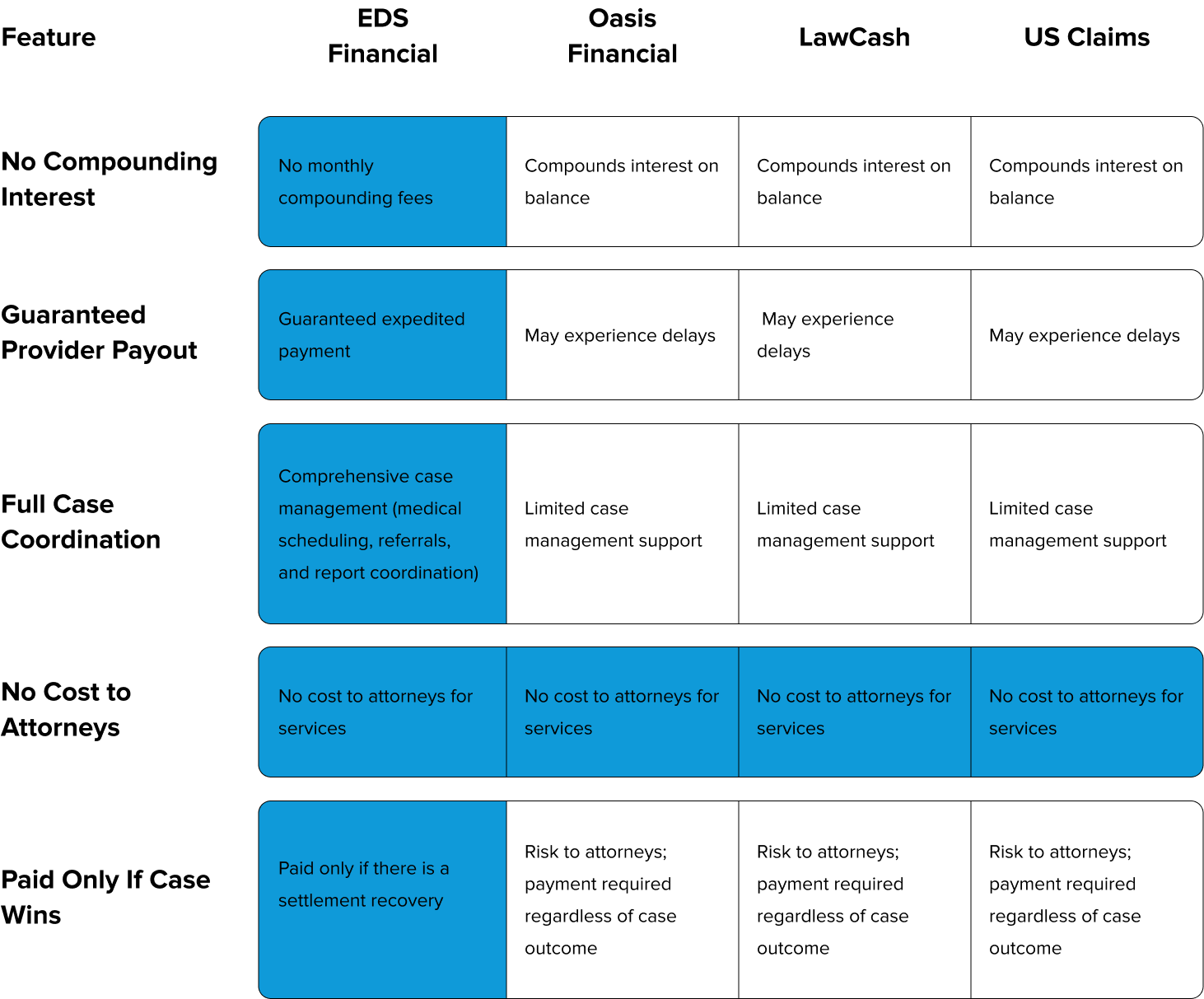 Attorneys face financial strain with upfront litigation costs and delays in medical lien payments. EDS Financial offers immediate funding with no monthly compounding fees, helping attorneys manage case expenses while ensuring providers get paid quickly.